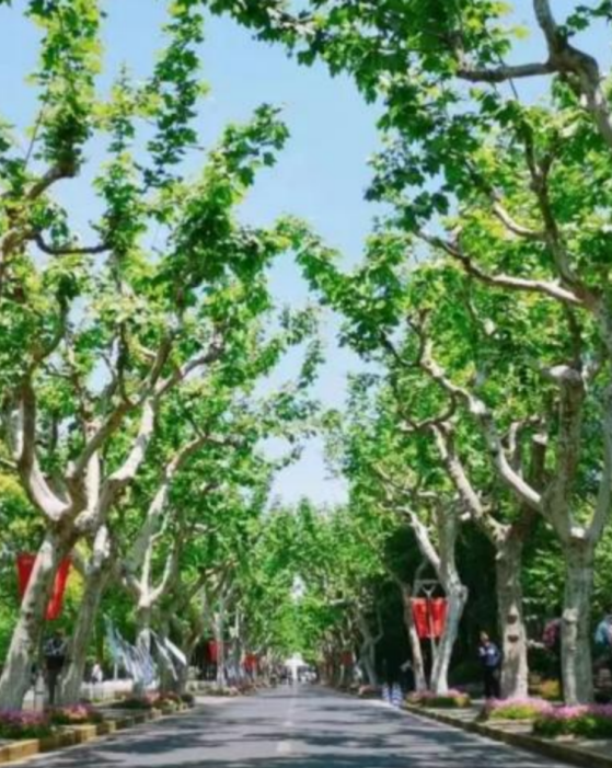 光华大道东西绵延约600米,道路两旁矗立着高大葱郁的梧桐,浓荫蔽日,被誉为复旦的“梧桐大道”。