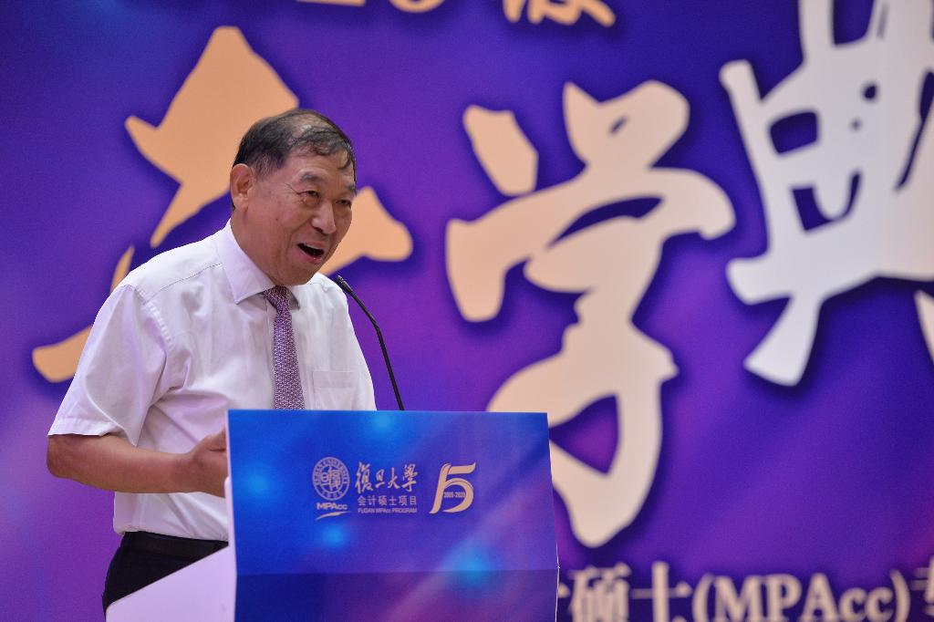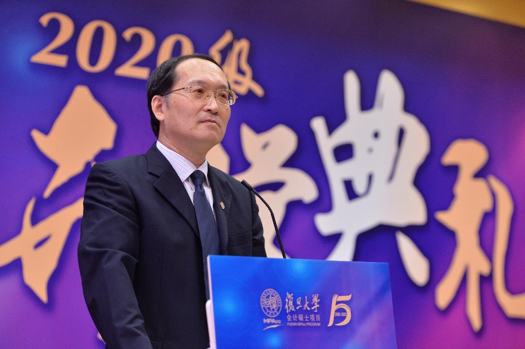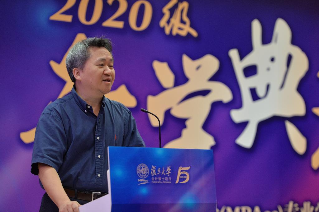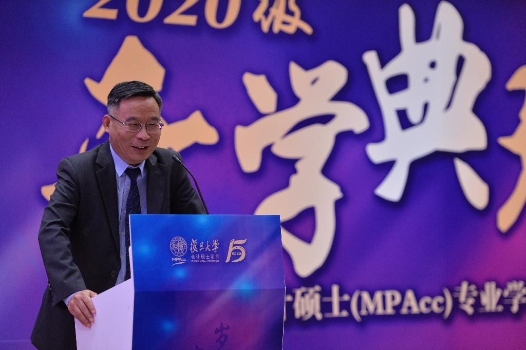 掌声雷动中,复旦大学MPAcc项目学术主任李若山教授上台致辞。作为复旦MPAcc最初的创项人员,李若山教授回忆了十五年前项目人员向教育部门据理力争,终于促成项目诞生的故事。接着,他向在座的2020级新生抛出三个问题——为什么要来读复旦MPAcc项目?怎么读复旦MPAcc?毕业之后怎么办?在目前的社会经济情况下,过去任何的能力训练都无法满足新形势的要求。社会变化是必然,人员淘汰也十分残酷,唯一的捷径就是通过系统的学习打磨能力、提升智慧。怎么读复旦MPAcc?每周末来学校上课,是辛苦的,但李若山教授鼓励同学们认真参与每一堂课、每一个学生活动和每一个案例讨论,切勿辜负复旦大学的一流教学水平。复旦大学是一个大师云集的教育平台,教授们的教诲值得同学们细细品味,或许一句话、一个观点就能点破你多年来的困惑。会计知识的更迭很快,复旦MPAcc项目培养的是能够独立思考的人才,有发现问题、分析问题和解决问题的能力和智慧,而不是紧盯着发票和账目。除了优质师资和培养理念,MPAcc考核制度非常严格,良好的教学制度是教学质量的前提保障。毕业之后怎么办?作为一个专业成长平台,复旦MPAcc希望所有学生都能“追梦而来,圆梦而去”,走出校门后,复旦MPAcc永远是同学们的可靠后盾,在座每一位的后半生都将与复旦大学管理学院、MPAcc项目紧密相连。