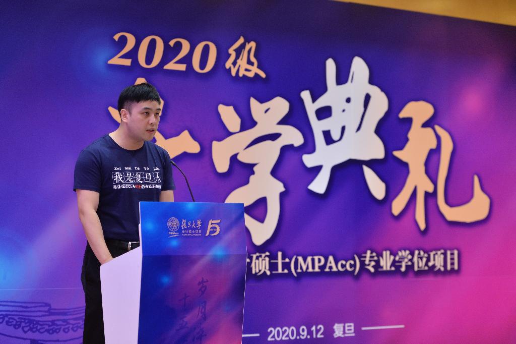 2019级1班学生代表杜翰上台发言,他首先对学弟学妹们的到来表示了热烈欢迎。杜翰强调“来复旦,读的不只是书”,除了学习基本的会计知识,最重要的是领悟复旦的人文情怀,达到思想上的进步。非全日制的优势就是在于能够将学校所学直接运用于实际,第一步就是要学会思考,思考的深度往往也在一定程度上决定了现实的高度。复旦校训是“博学而笃志,切问而近思”,指导学生博览群书并广泛学习,能坚守自己的志向,恳切地发问、求教,志存高远、勤于思考。杜翰希望同学们珍惜这段短暂的求学时光,发现校园生活的美好、同学友谊的珍贵,拥抱更好的自己。