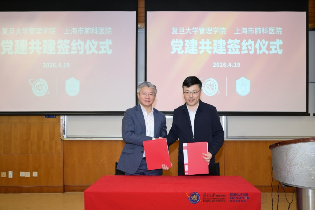 2026年4月19日,复旦大学管理学院党委与上海市肺科医院党委党建共建签约仪式在复旦大学管理学院顺利举行。复旦大学管理学院党委书记陆雄文、医院党委书记王晨分别代表各自单位,签署党建共建合作协议。