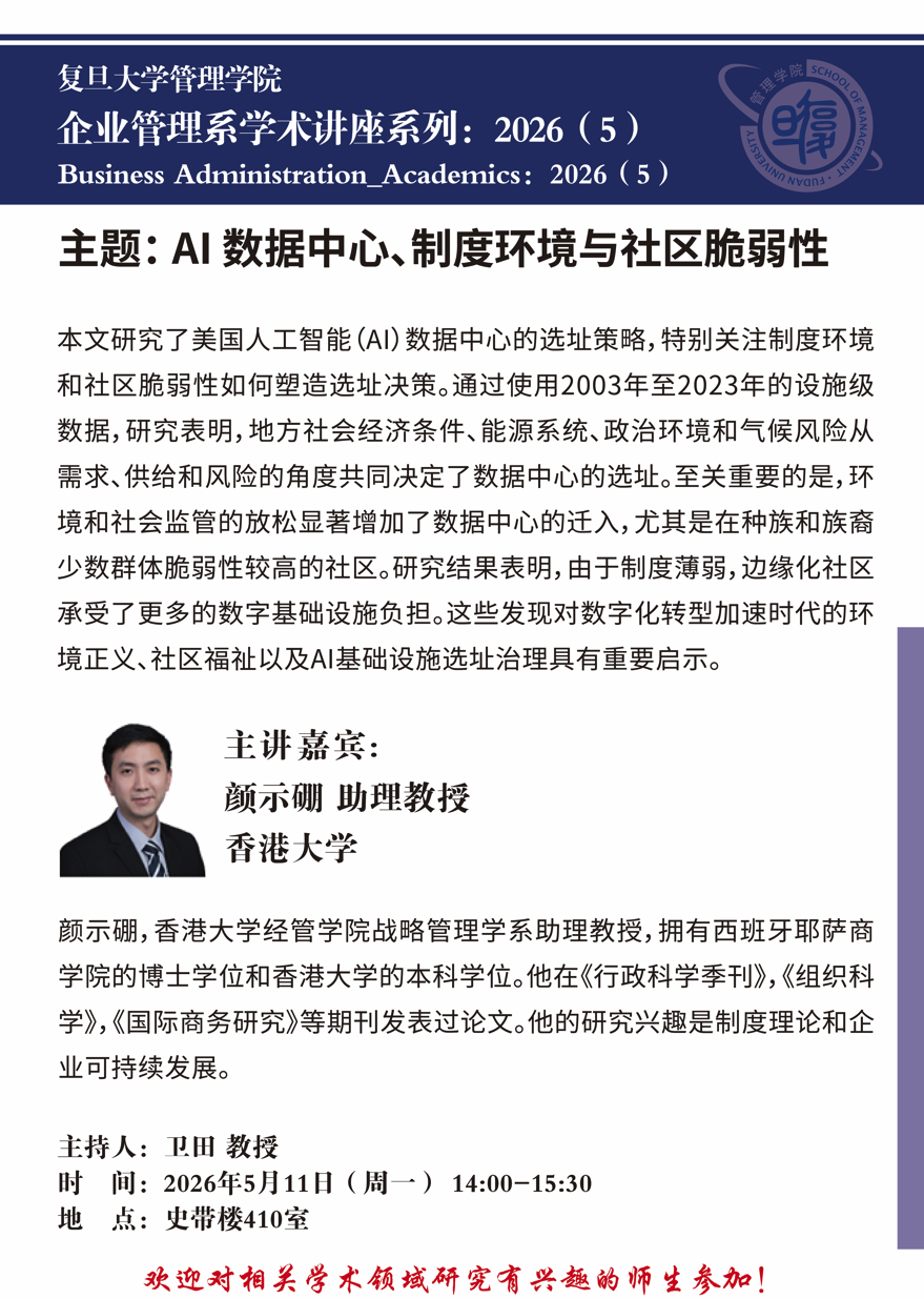 嘉宾简介:颜示硼,香港大学经管学院战略管理学系助理教授,拥有西班牙耶萨商学院的博士学位和香港大学的本科学位。他在《行政科学季刊》,《组织科学》,《国际商务研究》等期刊发表过论文。他的研究兴趣是制度理论和企业可持续发展。
