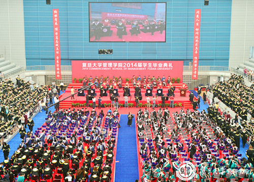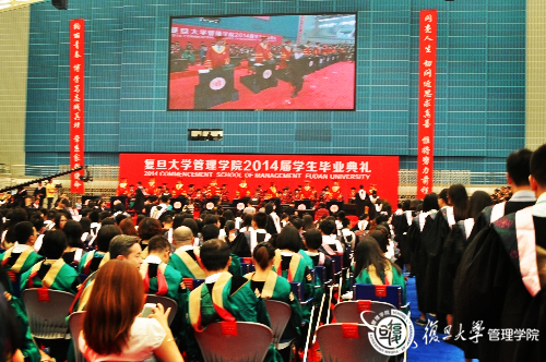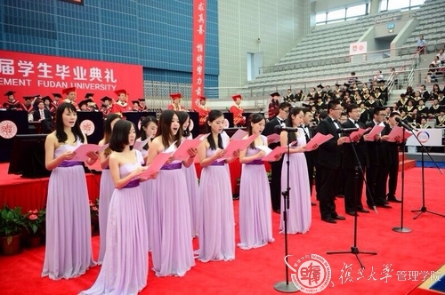 庄严的毕业生宣誓之后,复旦管院的学生合唱团深情地献唱了一首《You Raise Me Up》(《你鼓舞了我》),为毕业生们送上了最真挚的祝福。随后,全体师生共同唱响了复旦大学校歌,缅怀在复旦学习、生活的点点滴滴。在《送别》的歌声中,主礼团退场,各班级毕业生带着收获、祝福与荣耀,有序离场并与老师们合影留念。至此,复旦大学管理学院2014届学生联合毕业典礼圆满落幕。