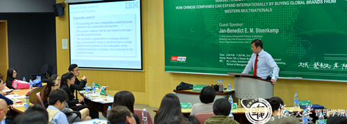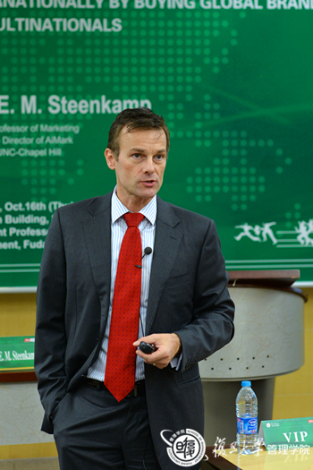 2014年10月16日晚,我院MBA项目主办的MBA论坛在李达三楼105室举行。美国北卡罗莱纳大学肯南商学院的市场营销学系教授Jan-Benedict E. M. Steenkamp就中国企业如何通过并购外国品牌来拓展国际市场做了主题演讲。身兼高等国际营销知识中心(AiMark)执行董事与复旦大学可持续创新和发展研究所研究员,Steenkamp教授曾获C. Knox Massey基金荣誉奖励,被评为过去十年最具影响力的营销学者。我院市场营销系肖莉博士主持论坛并致辞欢迎。