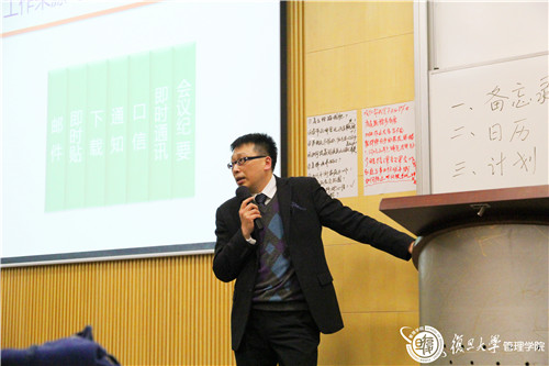 2014年12月2日,GTD“搞定”时间管理专职培训师、中国职业经理人协会理事、上海培训师联合会理事、上海时间管理实践小组召集人、英国IPMA 认证CIPT培训师--宋晓楠作客我院职业课堂,与在场的同学分享他独特的时间管理方法,帮助学生解决时间管理问题。
