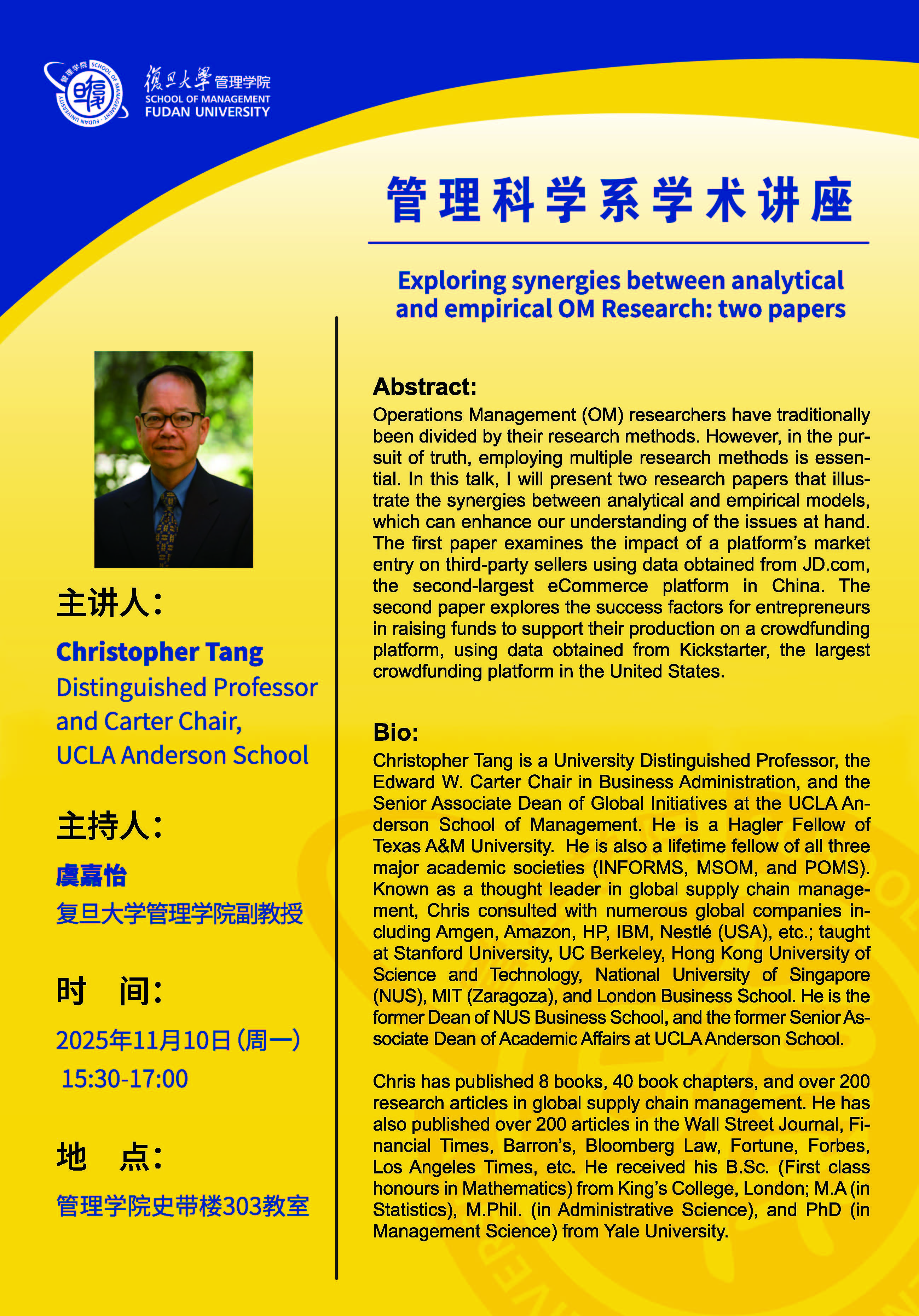 Bio of the speaker: Christopher Tang is a University Distinguished Professor, the Edward W. Carter Chair in Business Administration, and the Senior Associate Dean of Global Initiatives at the UCLA Anderson School of Management. He is a Hagler Fellow of Texas A&M University. He is also a lifetime fellow of all three major academic societies (INFORMS, MSOM, and POMS). Known as a thought leader in global supply chain management, Chris consulted with numerous global companies including Amgen, Amazon, HP, IBM, Nestlé (USA), etc.; taught at Stanford University, UC Berkeley, Hong Kong University of Science and Technology, National University of Singapore (NUS), MIT (Zaragoza), and London Business School. He is the former Dean of NUS Business School, and the former Senior Associate Dean of Academic Affairs at UCLA Anderson School.