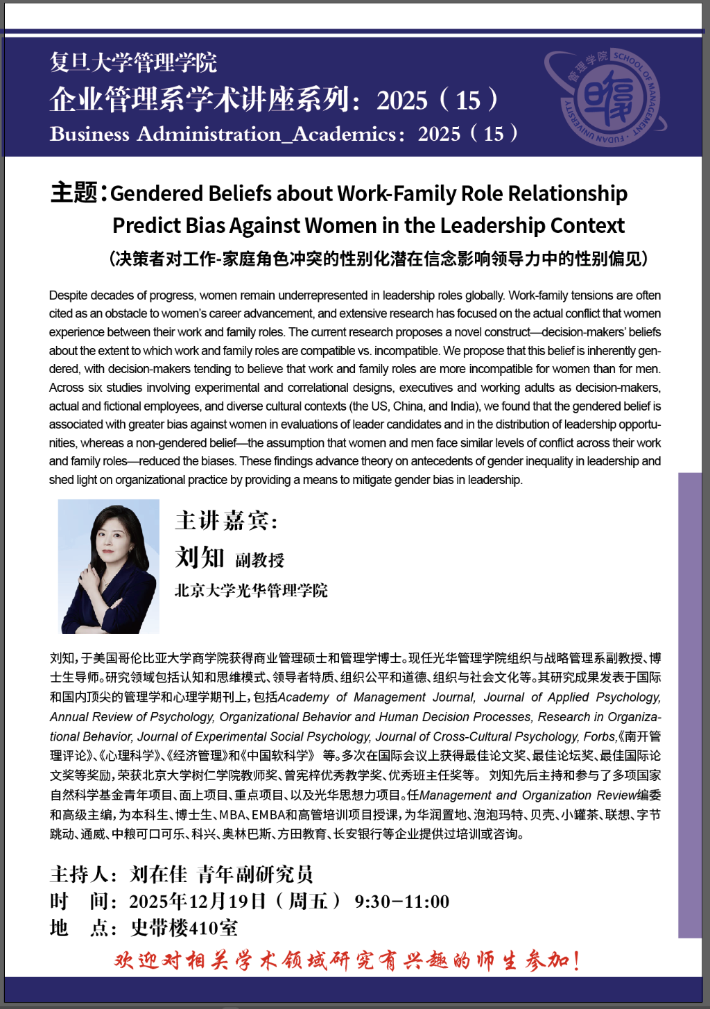 嘉宾简介:刘知,于美国哥伦比亚大学商学院获得商业管理硕士和管理学博士。现任光华管理学院组织与战略管理系副教授、博士生导师。研究领域包括认知和思维模式、领导者特质、组织公平和道德、组织与社会文化等。其研究成果发表于国际和国内顶尖的管理学和心理学期刊上,包括Academy of Management Journal, Journal of Applied Psychology, Annual Review of Psychology, Organizational Behavior and Human Decision Processes, Research in Organizational Behavior, Journal of Experimental Social Psychology, Journal of Cross-Cultural Psychology, Forbs,《南开管理评论》、《心理科学》、《经济管理》和《中国软科学》 等。多次在国际会议上获得最佳论文奖、最佳论坛奖、最佳国际论文奖等奖励,荣获北京大学树仁学院教师奖、曾宪梓优秀教学奖、优秀班主任奖等。 刘知先后主持和参与了多项国家自然科学基金青年项目、面上项目、重点项目、以及光华思想力项目。任Management and Organization Review编委和高级主编,为本科生、博士生、MBA、EMBA和高管培训项目授课,为华润置地、泡泡玛特、贝壳、小罐茶、联想、字节跳动、通威、中粮可口可乐、科兴、奥林巴斯、方田教育、长安银行等企业提供过培训或咨询。