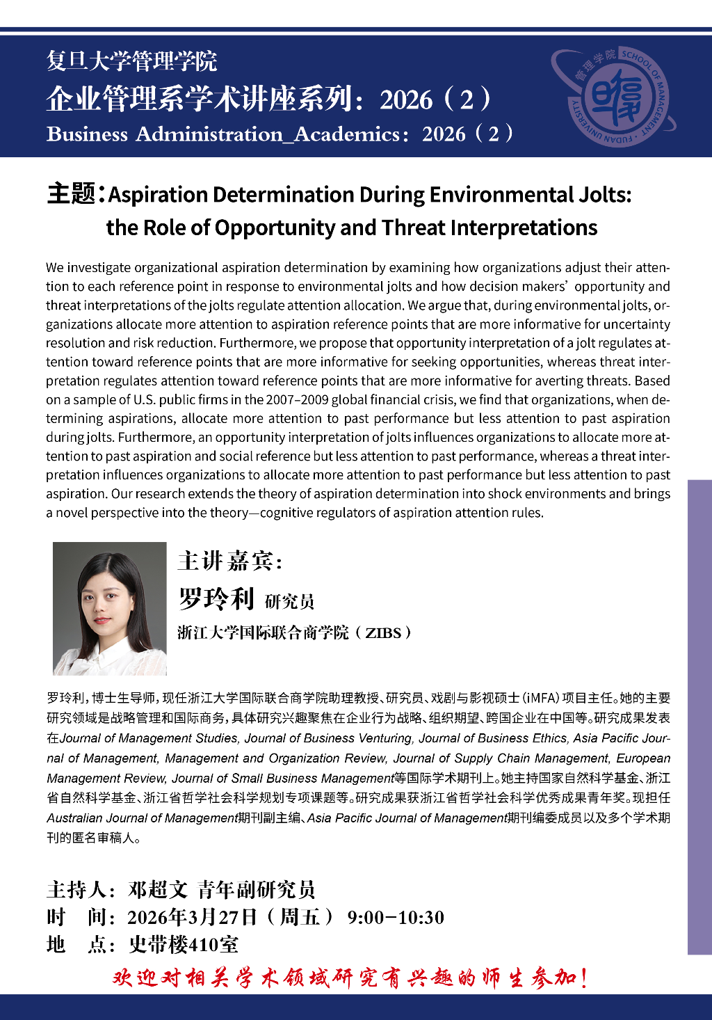 主题: Aspiration Determination During Environmental Jolts: the Role of Opportunity and Threat Interpretations