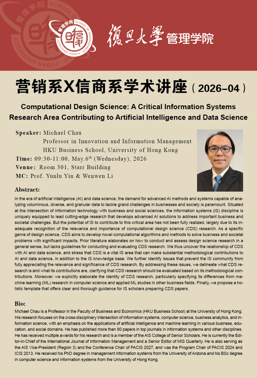 Bio:Michael Chau is a Professor in the Faculty of Business and Economics (HKU Business School) at the University of Hong Kong. His research focuses on the cross-disciplinary intersection of information systems, computer science, business analytics, and information science, with an emphasis on the applications of artificial intelligence and machine learning in various business, education, and social domains. He has published more than 90 papers in top journals in information systems and other disciplines. He has received multiple awards for his research and is a member of the AIS College of Senior Scholars. He is currently the Editor-in-Chief of the International Journal of Information Management and a Senior Editor of MIS Quarterly. He is also serving as the AIS Vice-President (Region 3) and the Conference Chair of PACIS 2027, and was the Program Chair of PACIS 2024 and ICIS 2013. He received his PhD degree in management information systems from the University of Arizona and his BSc degree in computer science and information systems from the University of Hong Kong.