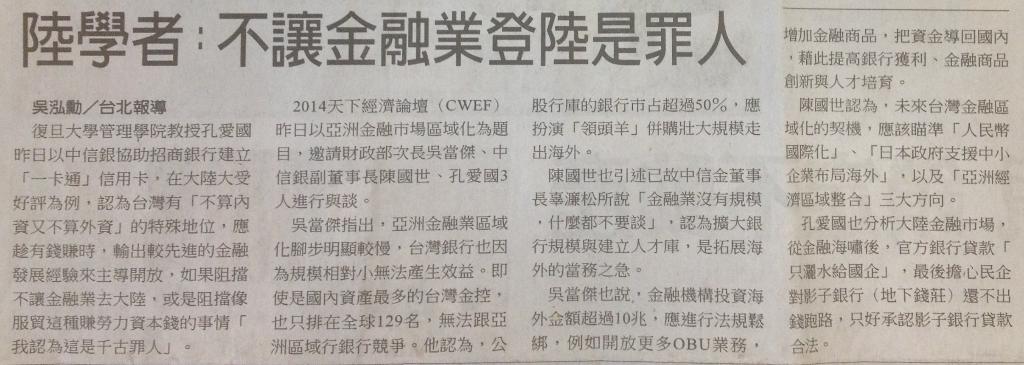 2014天下经济论坛(CWEF)昨日以亚洲金融市场区域化为题目,邀请财政部次长吴当杰、中信银副董事长陈国世、孔爱国3人进行与谈。