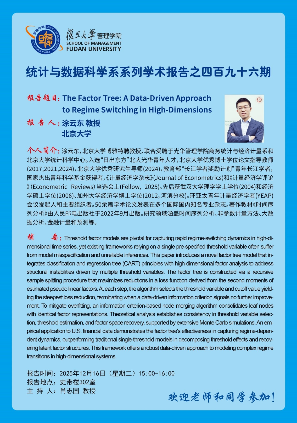 摘   要:Threshold factor models are pivotal for capturing rapid regime-switching dynamics in high-dimensional time series, yet existing frameworks relying on a single pre-specified threshold variable often suffer from model misspecification and unreliable inferences. This paper introduces a novel factor tree model that integrates classification and regression tree (CART) principles with high-dimensional factor analysis to address structural instabilities driven by multiple threshold variables. The factor tree is constructed via a recursive sample splitting procedure that maximizes reductions in a loss function derived from the second moments of estimated pseudo linear factors. At each step, the algorithm selects the threshold variable and cutoff value yielding the steepest loss reduction, terminating when a data-driven information criterion signals no further improvement. To mitigate overfitting, an information criterion-based node merging algorithm consolidates leaf nodes with identical factor representations. Theoretical analysis establishes consistency in threshold variable selection, threshold estimation, and factor space recovery, supported by extensive Monte Carlo simulations. An empirical application to U.S. financial data demonstrates the factor tree's effectiveness in capturing regime-dependent dynamics, outperforming traditional single-threshold models in decomposing threshold effects and recovering latent factor structures. This framework offers a robust data-driven approach to modeling complex regime transitions in high-dimensional systems.