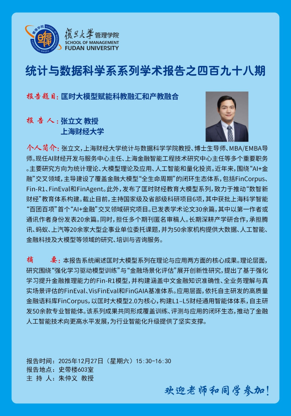 个人简介:张立文,上海财经大学统计与数据科学学院教授、博士生导师、MBA/EMBA导师。现任AI财经开发与服务中心主任、上海金融智能工程技术研究中心主任等多个重要职务。主要研究方向为统计理论、大模型理论及应用、人工智能和量化投资。近年来,围绕“AI+金融”交叉领域,主导建设了覆盖金融大模型“全生命周期”的闭环生态体系,包括FinCorpus、Fin-R1、FinEval和FinAgent。此外,发布了匡时财经教育大模型系列,致力于推动“数智新财经”教育体系构建。截止目前,主持国家级及省部级科研项目6项,其中获批上海科学智能“百团百项”首个“AI+金融”交叉领域研究项目。已发表学术论文30余篇,其中以第一作者或通讯作者身份发表20余篇。同时,担任多个期刊匿名审稿人。长期深耕产学研合作,承担腾讯、蚂蚁、上汽等20余家大型企事业单位委托课题,并为50余家机构提供大数据、人工智能、金融科技及大模型等领域的研究、培训与咨询服务。