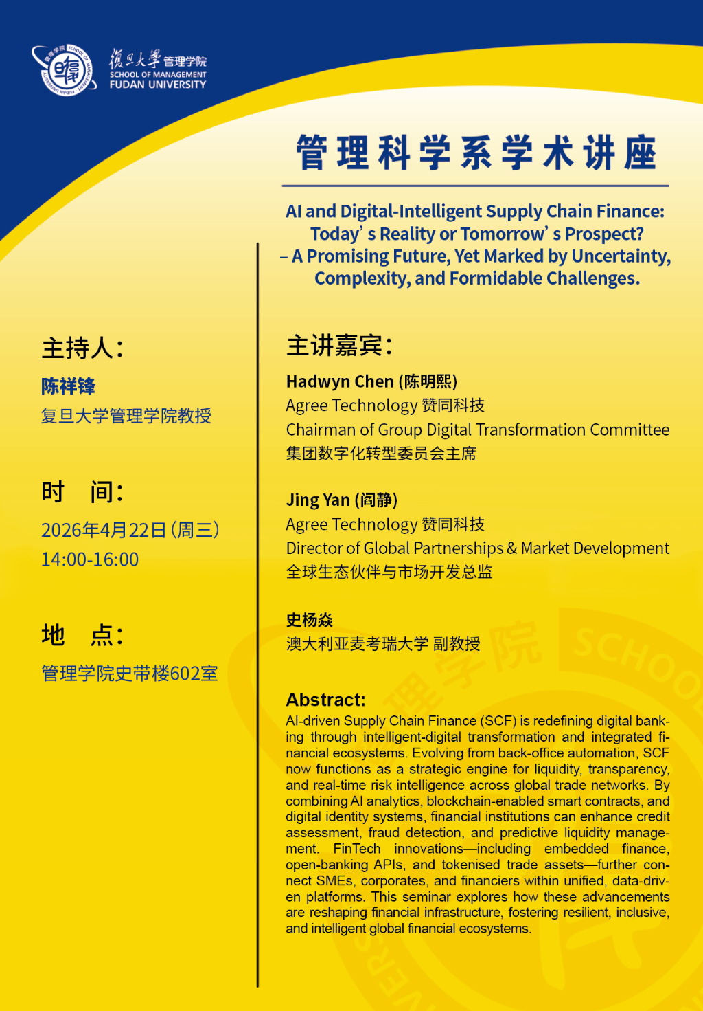 主 题:AI and Digital-Intelligent Supply Chain Finance: Today’s Reality or Tomorrow’s Prospect?– A Promising Future, Yet Marked by Uncertainty, Complexity, and Formidable Challenges.