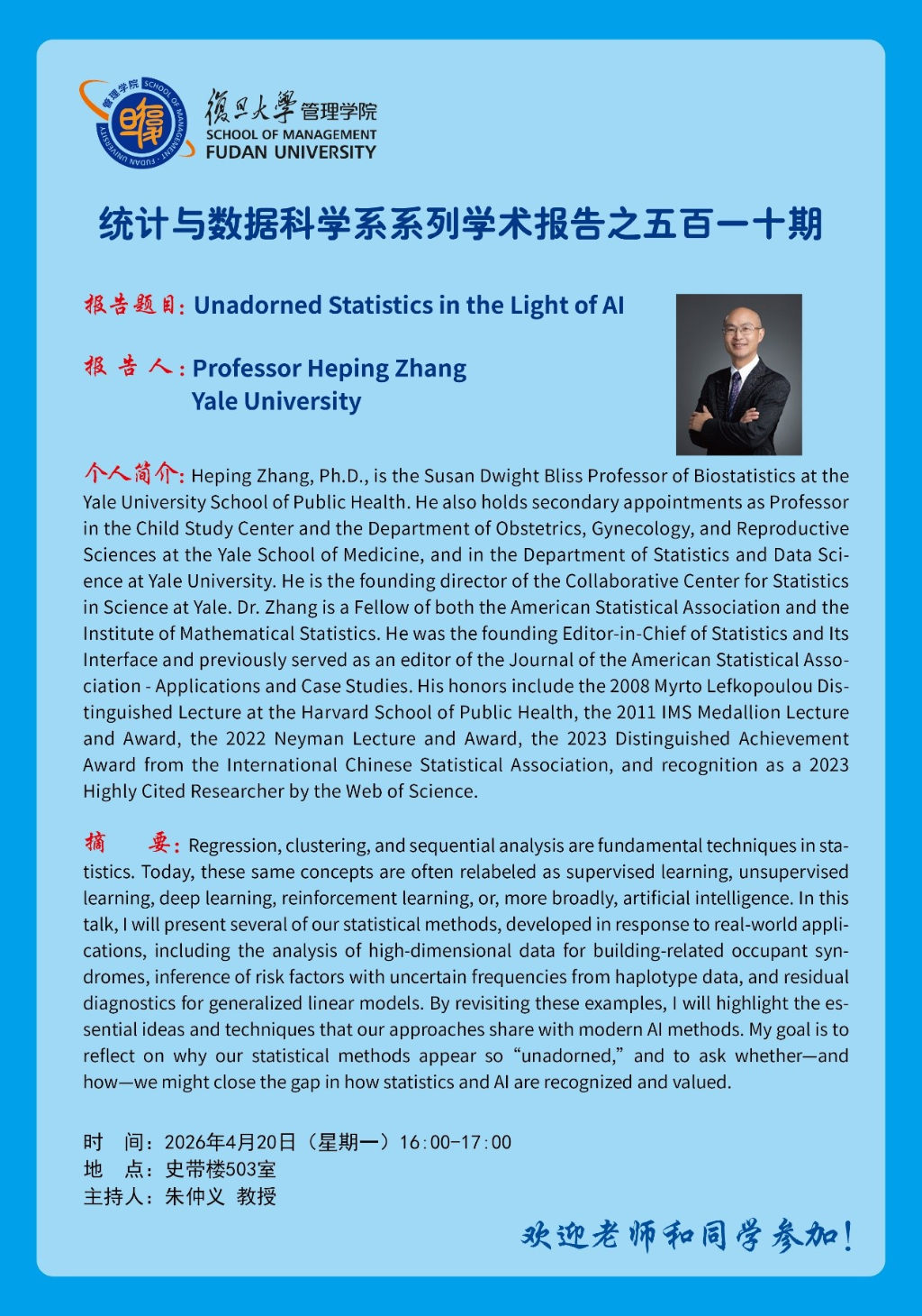 个人简介:Heping Zhang, Ph.D., is the Susan Dwight Bliss Professor of Biostatistics at the Yale University School of Public Health. He also holds secondary appointments as Professor in the Child Study Center and the Department of Obstetrics, Gynecology, and Reproductive Sciences at the Yale School of Medicine, and in the Department of Statistics and Data Science at Yale University. He is the founding director of the Collaborative Center for Statistics in Science at Yale. Dr. Zhang is a Fellow of both the American Statistical Association and the Institute of Mathematical Statistics. He was the founding Editor-in-Chief of Statistics and Its Interface and previously served as an editor of the Journal of the American Statistical Association - Applications and Case Studies. His honors include the 2008 Myrto Lefkopoulou Distinguished Lecture at the Harvard School of Public Health, the 2011 IMS Medallion Lecture and Award, the 2022 Neyman Lecture and Award, the 2023 Distinguished Achievement Award from the International Chinese Statistical Association, and recognition as a 2023 Highly Cited Researcher by the Web of Science.