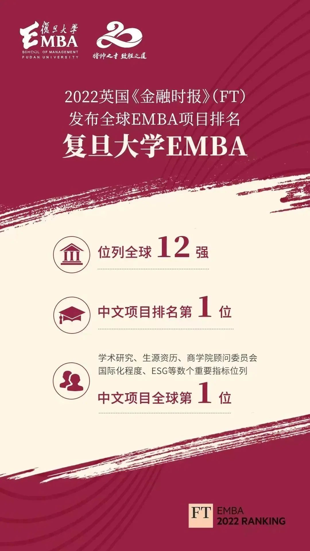 2022年是复旦大学EMBA项目成立二十周年,围绕“将帅之才,致胜之道”的培养目标,EMBA项目和管理学院在二十年过程中取得了卓越成就,培养了无数优秀企业家,他们为推动中国本土进步、推动全球进步、推动商业文明进步贡献了重要力量。