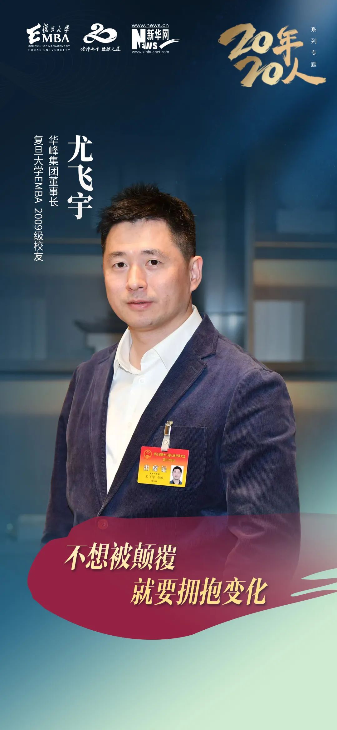 复旦大学EMBA联合新华网共同推出《20年20人》专题报道,共同聚焦这二十年来推动中国商业文明进步的企业家校友们。本期我们专访了复旦EMBA 2009级校友、华峰集团董事长尤飞宇,分享从“创一代”到“企二代”,家族企业代际传承的“阵痛”与“破局”。