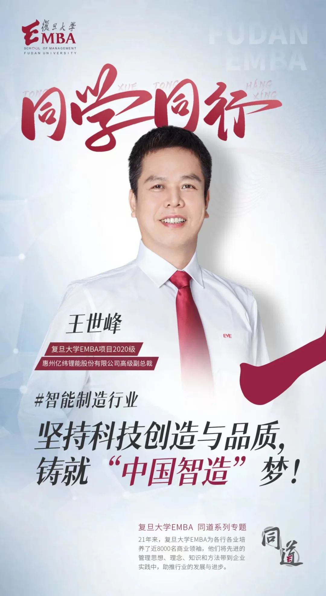 本期《同学同行》专访了复旦大学EMBA项目2020级6班、惠州亿纬锂能股份有限公司高级副总裁王世峰,探讨新能源产业的发展趋势和对中国智能制造业的影响。