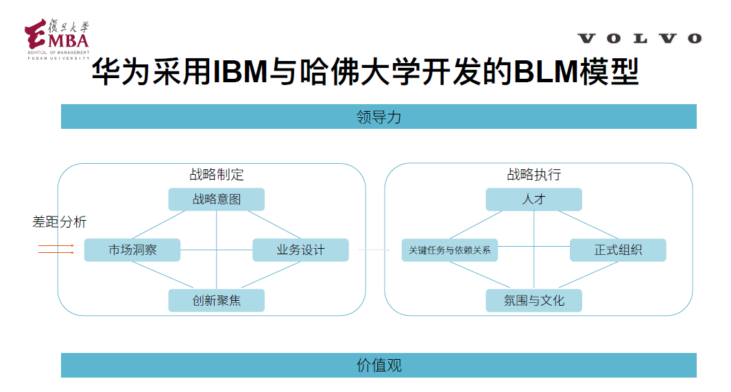 从纵向来看,价值观是根本,领导力是前提。通过领导力进行牵引,价值观作为保障,大致保证一次次做战略规划和战略选择能够正确。领导力和价值观是整个模型里面的精髓。对于领导力的要求就是三个力:敏锐的洞察力、强大的组织力、坚持不懈的执行能力。而这一切都需要价值观来支撑,一个公司的基本算法就是价值观。德鲁克在《管理的实践》里面提出,企业的基本原则是为客户创造价值,为员工创造价值,为社会/合作伙伴创造价值。企业最基本法则就是这三个价值。整体来看,BLM是一种算法,或者说一种语言,归根到底是一种思维框架。