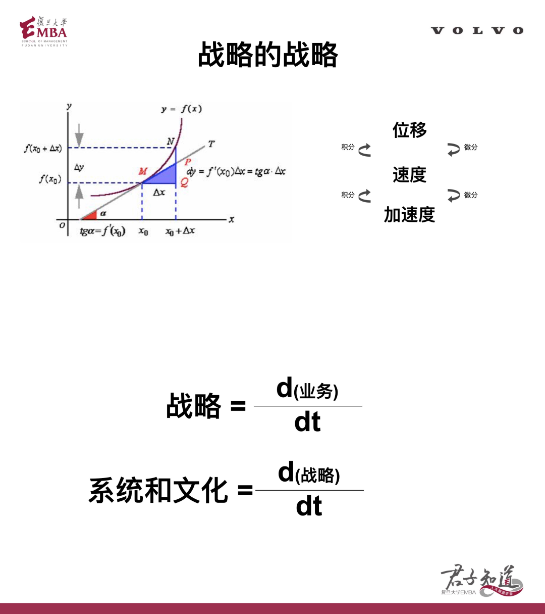 微积分是哲学思想,牛顿从微观中去见宏观,从宏观中去见微观,确实是天才的想法。我们的人生就是如此,大量的东西都是不断地点点滴滴积累起来的,由连续的微小变化形成宏观的走势。微积分是牛顿研究物体运动所得,特别是如何计算物体的瞬时速度,通过位移的一阶导数得出瞬时速度,根据速度的一阶导数得出加速度。我们回到企业的经营,如果企业年收入从A点做到B点,也可以理解为位移,那么我们把业务求一阶导数的话,得出来的是战略的方向(业务变化的斜率)。战略再求一阶导数后就是战略的战略(战略变化的斜率),这对企业来讲就是那个相对不变的东西,是他们的文化、价值观和体系。这就是牵引战略选择不断走向正确方向的基本逻辑。
