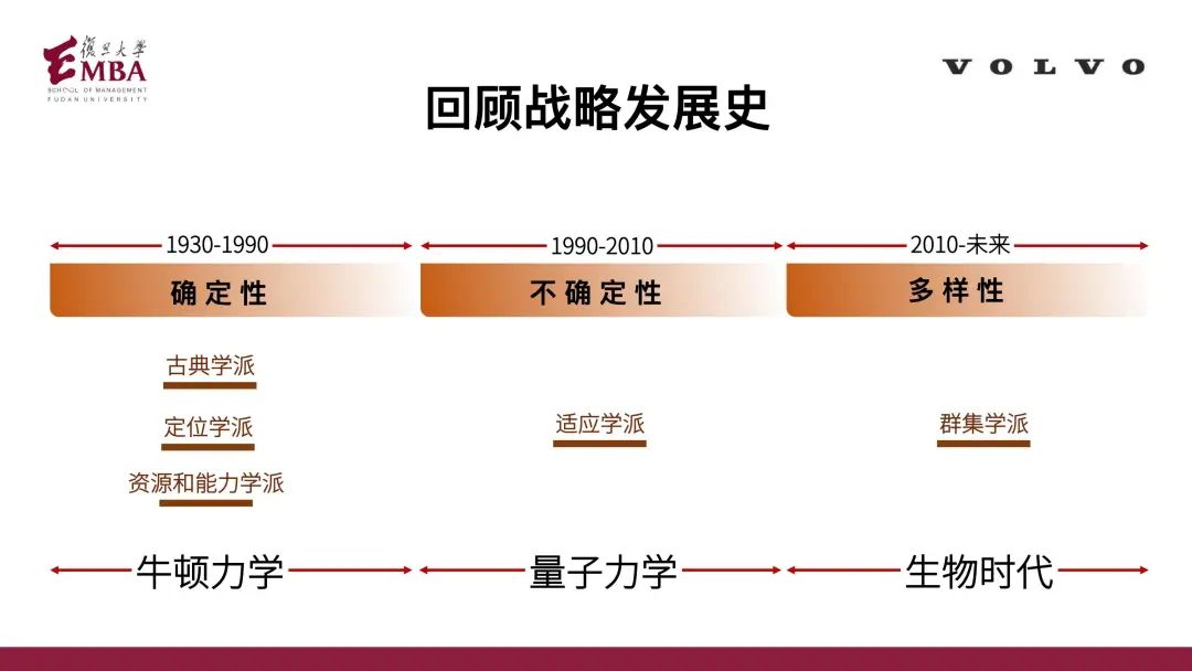 我们再通过对战略演变的研究,去看未来的发展。从思想方法的层面来看,企业战略的历史可以分为三个大阶段:即从牛顿力学所谓的确定时代,到量子力学不确定的时代。到2010年以后,随着移动互联网的发展,群集模式开始涌现,这个阶段的战略是进化出来的,跟生物的适应性是相结合的,所谓生物时代。