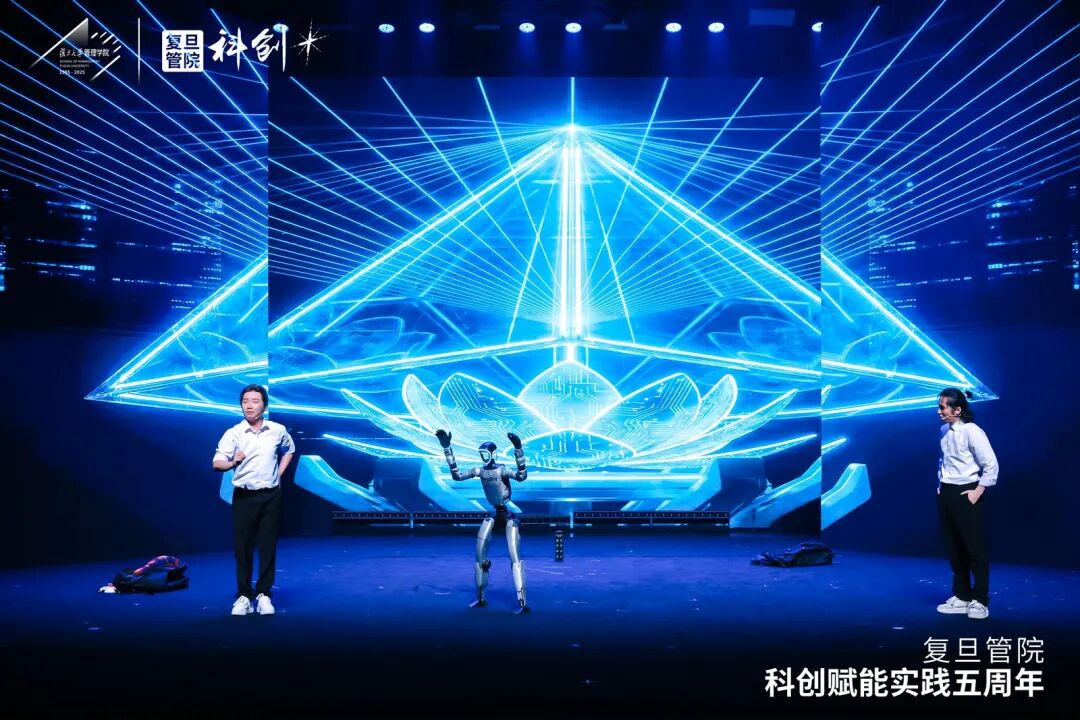 On the afternoon of December 6, Fudan SoM premiered China's first stage drama dedicated to sci-tech entrepreneurs at the C Building Theater of Zhengli Campus. Based on real entrepreneurial stories, the production was written and directed by Professor Pengxin Yang and his team, with performers from Shanghai Theatre Academy, New York University, and Fudan University, and featured special appearances by Unitree robots and robotic dogs.