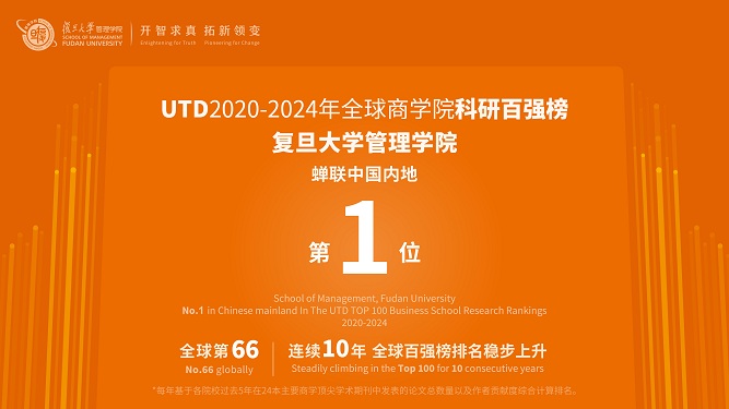 Several decades of hard work have led to great achievements in various disciplines and research areas, with some being highly influential both home and abroad, as well as a long list of top-level academic papers, theses and patents, an array of outstanding leaders in all kinds of academic researches, and plenty of high-quality research teams. In the 2025 UT Dallas Top 100 Business School Research Rankings (2020-2024), FDSM secured the 66th position globally while retaining its No.1 ranking in Chinese mainland, demonstrating consistent progress with its position steadily ascending for ten consecutive years.