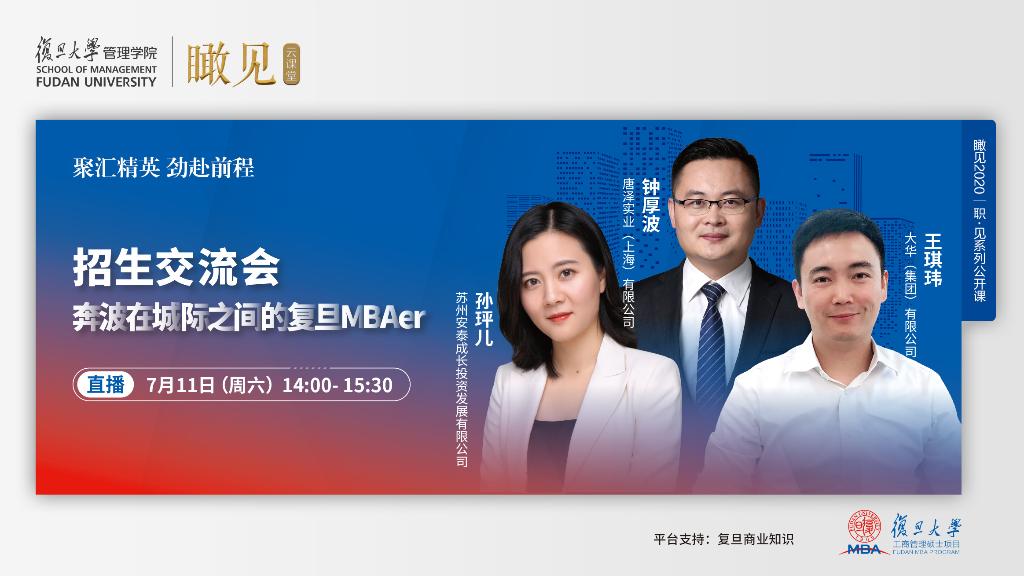 点击进入报名招生交流会---奔波在城际之间的复旦MBAer,直播链接将于活动前1天通过邮件或短信的方式发送。