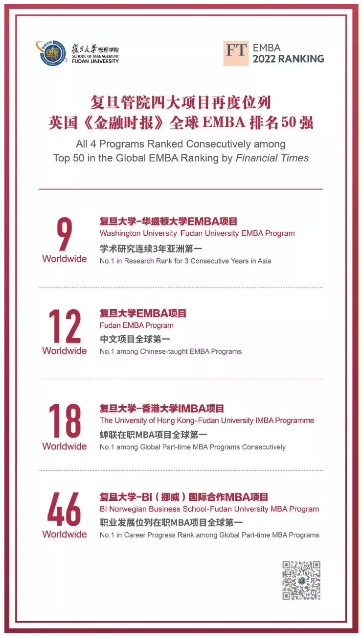 英国《金融时报》2022全球排名第12位,位列中文项目全球第一,同时,四大项目连续三年位列全球50强