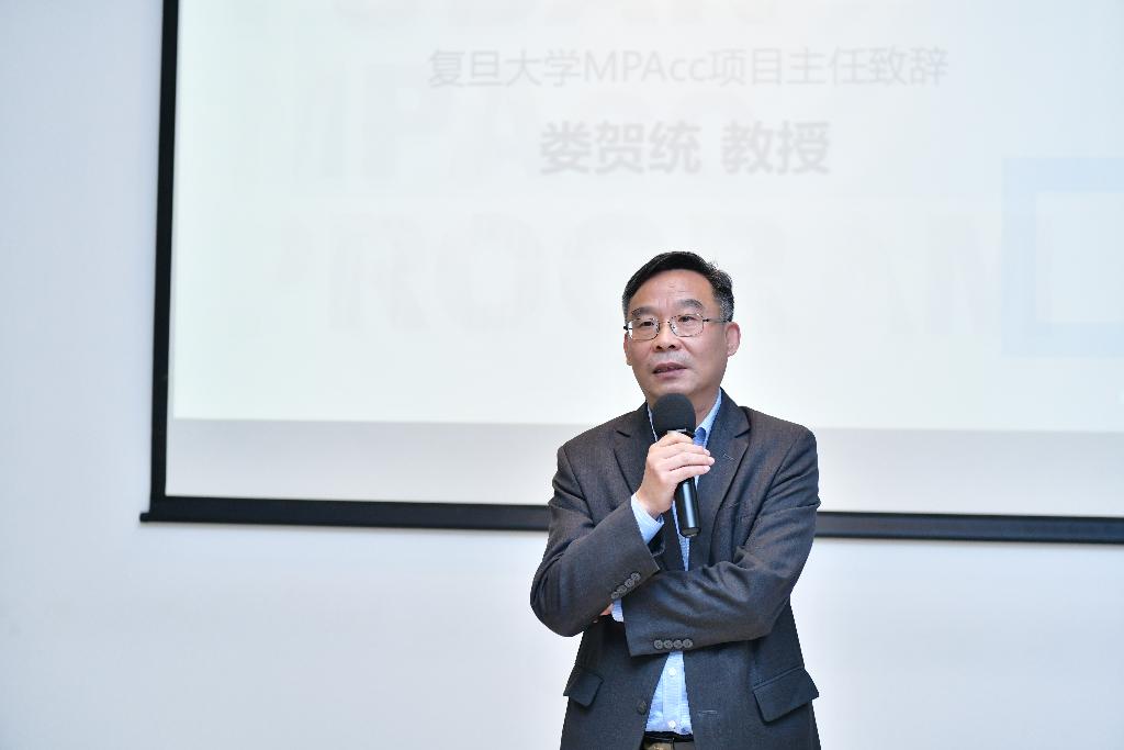 随后,复旦大学MPAcc项目主任娄贺统教授为大家致辞。娄老师首先感谢了各位校友导师的大力支持,其次回顾了开展校友导师计划的初衷,第一是希望校友导师的丰富职场经验和人生体验可以为同学指点迷津;第二,希望导师丰富的职场实践经验能够为同学们提供论文写作素材上的支持。其次,娄老师总结了2017年以来校友导师计划获得的成绩,不仅在同学们之中广受好评,在校友导师之间也留下了非常好的印象。接着,娄老师对参加校友导师计划的同学们提出要求,同学们应更主动地与校友导师互动交流。