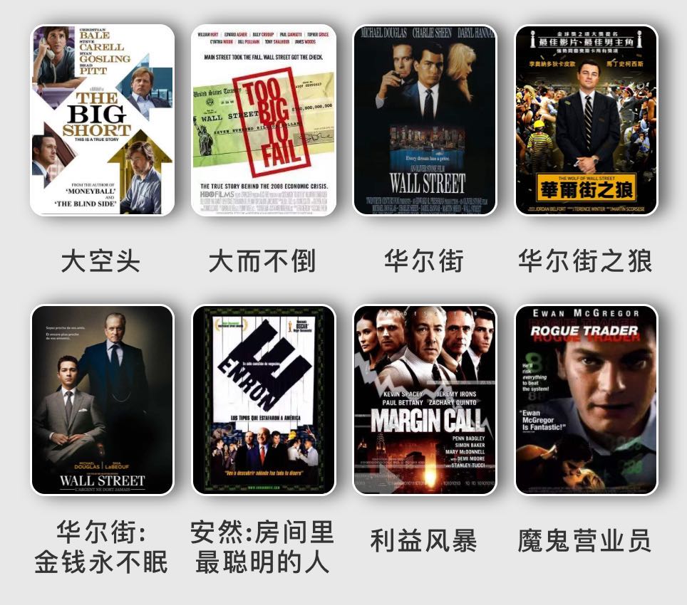 最后,夏爱萍同学还为整理了一些金融类电影清单:《大空头》《大而不倒》《华尔街》《华尔街之狼》《华尔街:金钱永不眠》《安然:房间里最聪明的人》《利益风暴》《魔鬼营业员》。