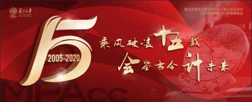 2020年12月19日晚,以“乘风破浪十五载,会鉴古今计未来”为主题,本次复旦大学MPAcc十五周年庆暨2021年新春晚会采用线下线上结合的形式隆重召开。“冬严日不暖,岁晚风多朔。”刚刚经历了一阵冬雨,上海于2020年即将谢幕之际迎来了真正意义上的寒冬,但是天气的寒冷阻挡不了复旦cc人的热情。值此辞旧迎新、共庆复旦MPAcc十五周年之际,复旦大学管理学院副院长殷志文教授,复旦大学MPAcc项目主任娄贺统教授,复旦大学管理学院统计学系黎德元教授,复旦大学管理学院校友中心主任段邵斌老师,及数十位师生欢聚李达三楼报告厅,驻足当下,回望复旦MPAcc项目一路走来的辉煌与成就,不忘初心;着眼未来,翘盼项目更上一层楼,奋斗不息。