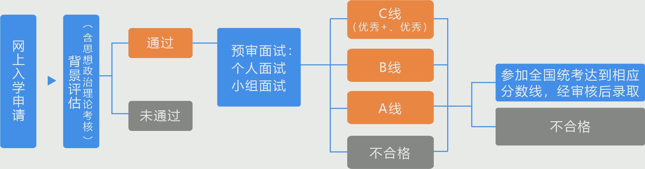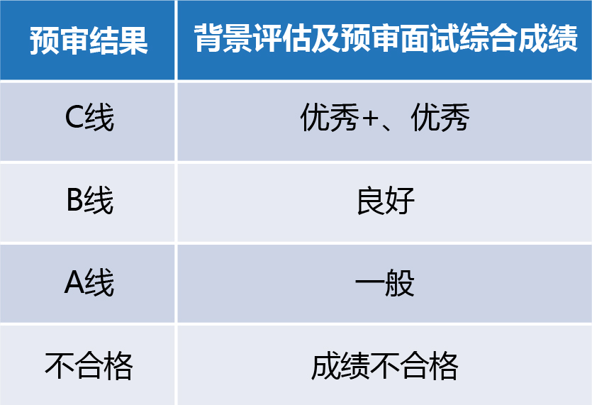 4、前一年预审结果为C线(优秀+)的申请人,必须在预审系统中完成当年申请,经考核通过后,方可在当年获得C线的条件录取资格线。