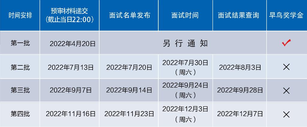 3、申请人在报考当年只能提交一次预审申请并参加一次预审面试。面试当天如申请人无故缺席,将视作自动放弃当年的申请,该入学年份内将不再被接受申请。