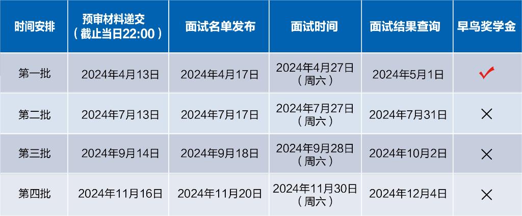 3、申请人在报考当年只能提交一次预审申请并参加一次预审面试。面试当天如申请人无故缺席,将视作自动放弃当年的申请,该入学年份内将不再被接受申请。