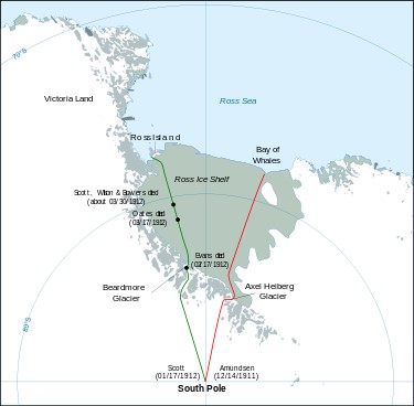 1910年10月,当他带领探险队向南极出发的同时,另外一位英国探险家罗伯特·斯科特(Robert Scott)也率领一支探险队出发了。两支队伍展开了一场著名的时间竞赛。