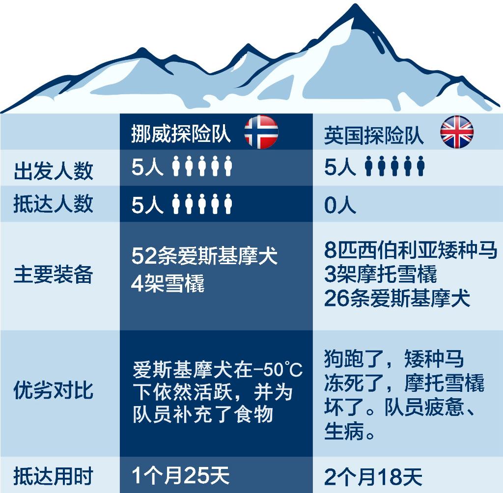 探险过程中,英国人用来拉雪橇的西伯利亚矮种马适应不了极地严寒,又都深陷雪中,导致大量死去,最后只好用人力拉雪橇。相比之下,挪威人选择狗显然明智得多。因为爱斯基摩犬在-50℃的低温中仍然活蹦乱跳。常年与严寒做斗争的北欧人,更懂得如何应对极地的恶劣气候和环境。