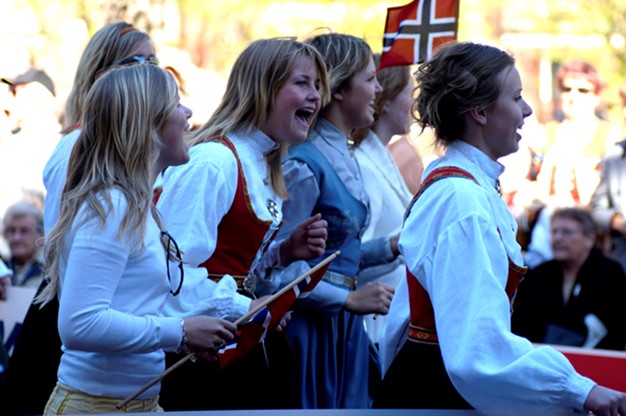国庆日当天,挪威人会在各处挂上国旗,将家里收拾一新,与全家人一起进餐,随后身着传统服装上街游行。这一天,通向奥斯陆王宫的卡尔约翰大街变成了人头攒动的海洋,挪威人高举挪威国旗,脸上洋溢着幸福自豪的表情。
