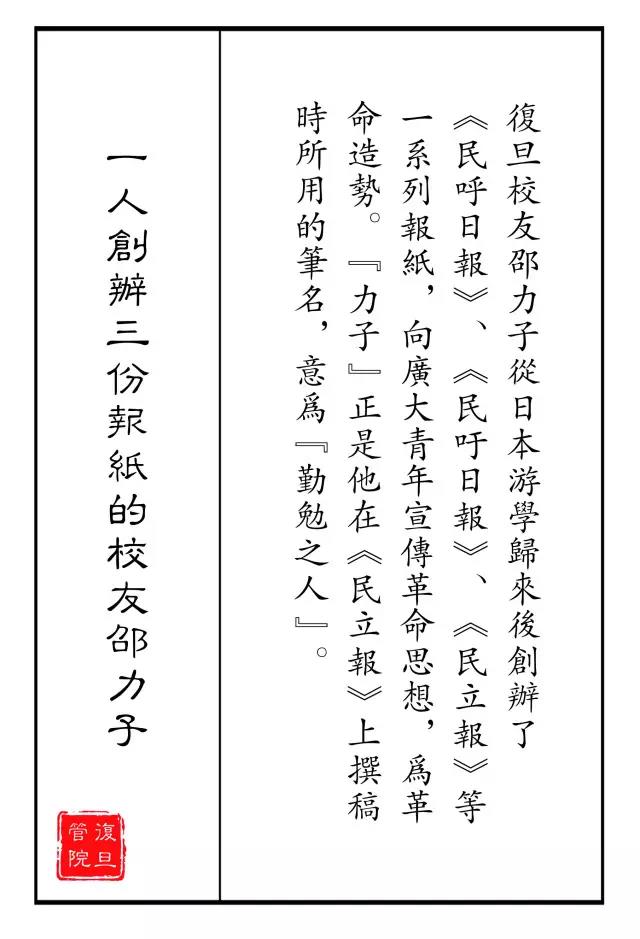复旦校友邵力子(1882年~1967年)从日本游学归来后创办了《民呼日报》、《民吁日报》、《民立报》等一系列报纸,向广大青年宣传革命思想,为革命造势。