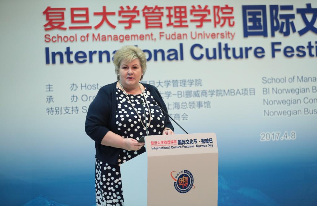 2017年4月8日,挪威首相索尔贝格出席复旦管院首届国际文化节“挪威日”,在发言中她表示,希望两国能继续深入拓展各个领域的交流与合作,尤其是在教育行业,希望所有人能够为此付出一份努力,并寄语在场的听众,要继续共享知识,感受不同的文化。同年5月初,索尔贝格女士再次应邀参与了在BI挪威商学院举办的“China Day”活动,和复旦大学校长许宁生、BI挪威商学院校长Inge Jan Henjesand、MBA24班同学们一起,就教育领域话题进行了交流和探讨,为教育行业的发展身体力行。