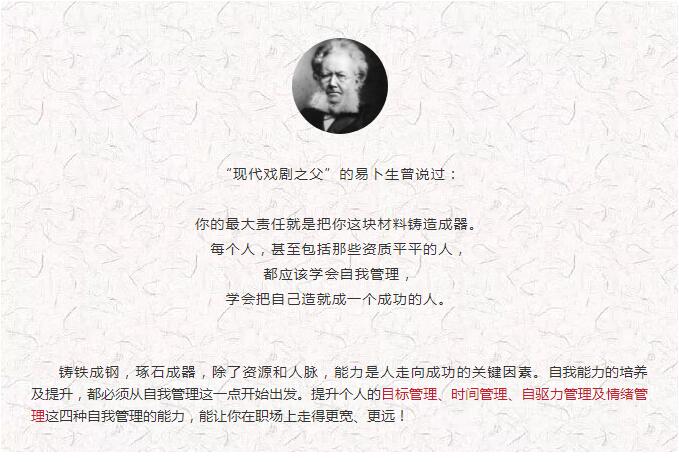 自我管理是一项重要能力,只有把自我管理好,严格按照自己定下的目标,规划好自己的时间,凭借自驱力推动自己不断向前努力;并在执行中、在协调和沟通中、在面对成功与失败时,通过情绪的管理,助力自己一步步实现目标。