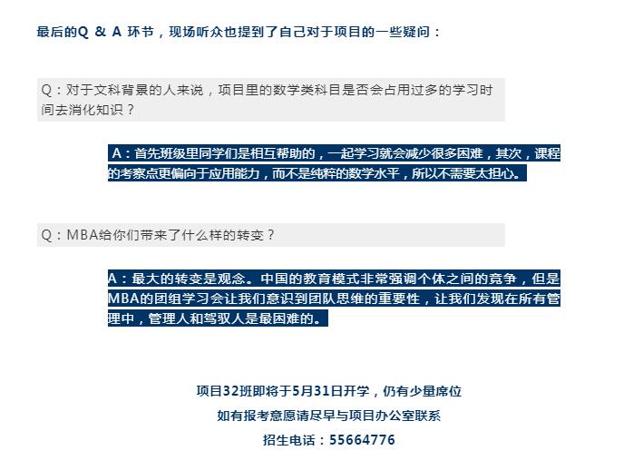 最后是感恩。从开始读书到毕业这么多年,如果把我看作是MBA项目的一个产品,那我想这个产品还算合格的,不管是在职业上还是在人生的道路上我还都是向上在走,称不上顶尖,但一直在前进。有一点我特别想强调:我们都是成年人,可以独立选择而非模仿他人随波逐流,因此必须要想清楚,下一个10年我想变成什么样的人,什么才是真正适合我的,想明白这些,再去做选择。