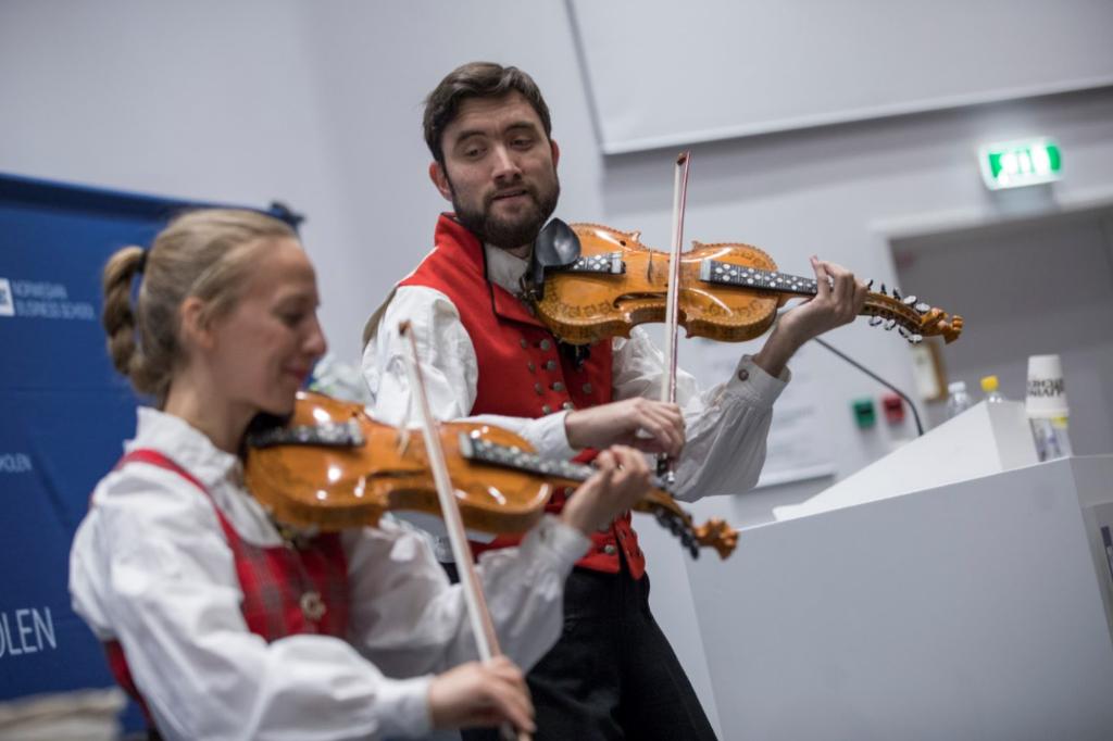下午3点,典礼正式开始,大家身着BI蓝硕士袍走入礼堂,两位挪威艺术家用传统挪威乐器演奏作为开场,琴声悠扬悦耳,余音袅袅,自然之美从艺术家的指尖缓缓流出,悠悠地淌入在场每个人的心间。