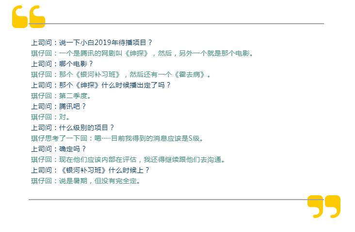 当杨天真要求琪仔做一份白宇年度总结和一份新年整体规划时,琪仔在整个过程中,都表现出了对自己的艺人不了解,对做完的和即将执行的任务不做梳理,既没逻辑,也没重点。进老板办公室不到五分钟就被上司“打回去重做。”