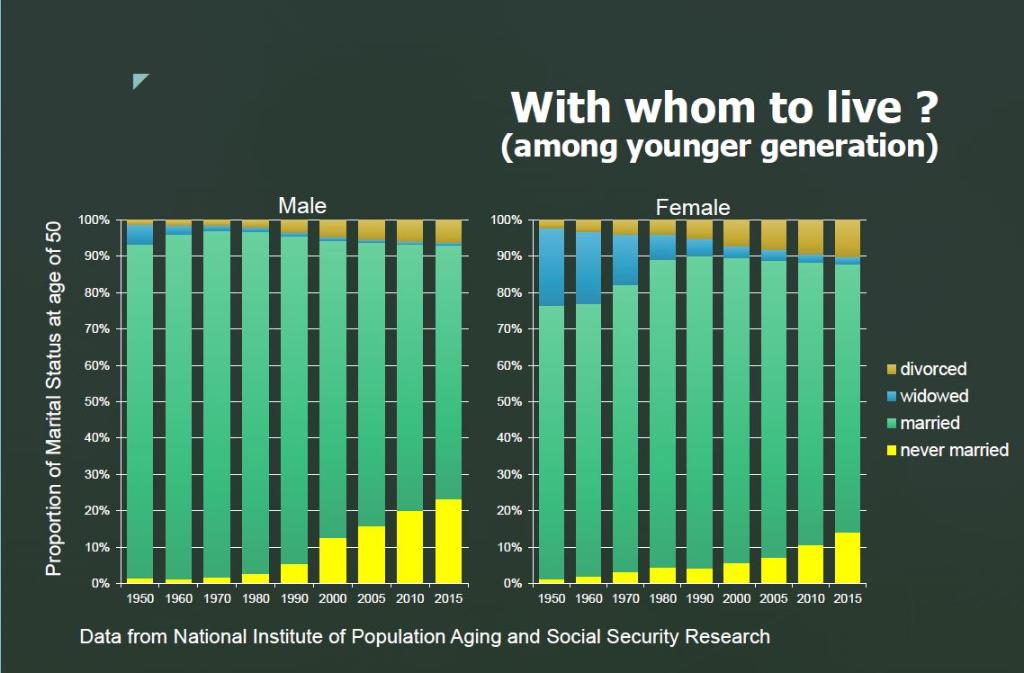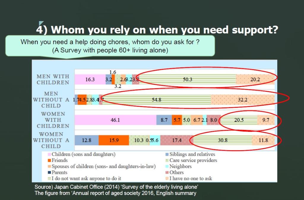 日本人的传统文化中,成年人都不喜欢去麻烦别人,所以很多人选择了在老年之后独居或和自己的配偶住在一起。这就需要社会给与老年人的生活提供自助便利。男性老年人更倾向于靠自己,也更显得孤独,他们很少能够走到社群里去和其他老人互动,这也引发了一些心理问题。