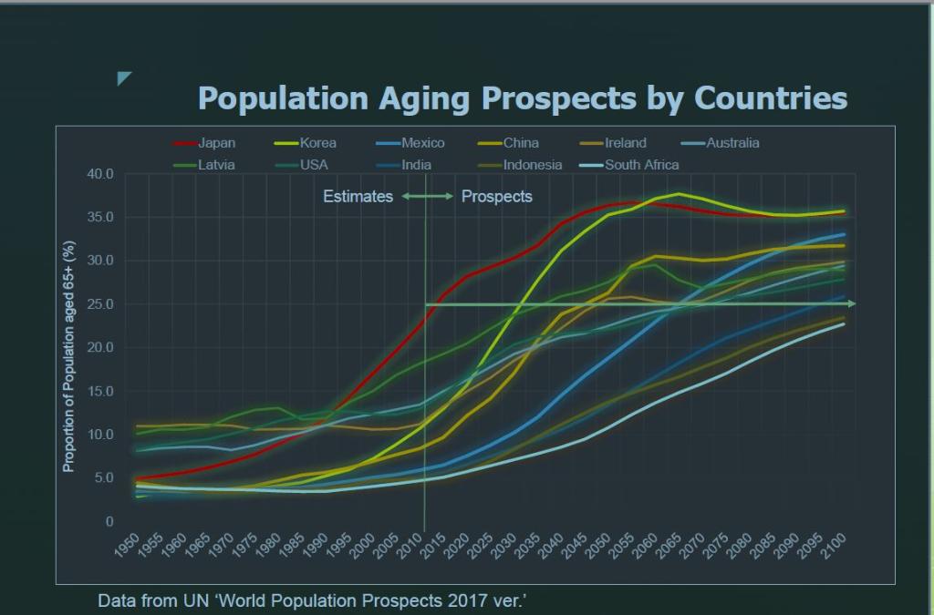 此次GNAM EMBA Week日本站的主题是INNOVATION x GLOBALIZATION - Super Aging Society Japan。超老龄化并不是一个只存在于日本的话题,近几年全球老龄化都有不同程度的呈现,尤其是发达国家,其中韩国和新加坡的老龄化程度已经迅速接近日本。韩国生育率甚至已降到1.0以下,而正常的人口生育率至少是2.1才能保持人口稳定。日本目前是1.4,日本政府希望2025年能达到1.8的目标。日本作为近20年第一批在老龄化社会的研究和应用方面有进展的国家,有很多借鉴之处。