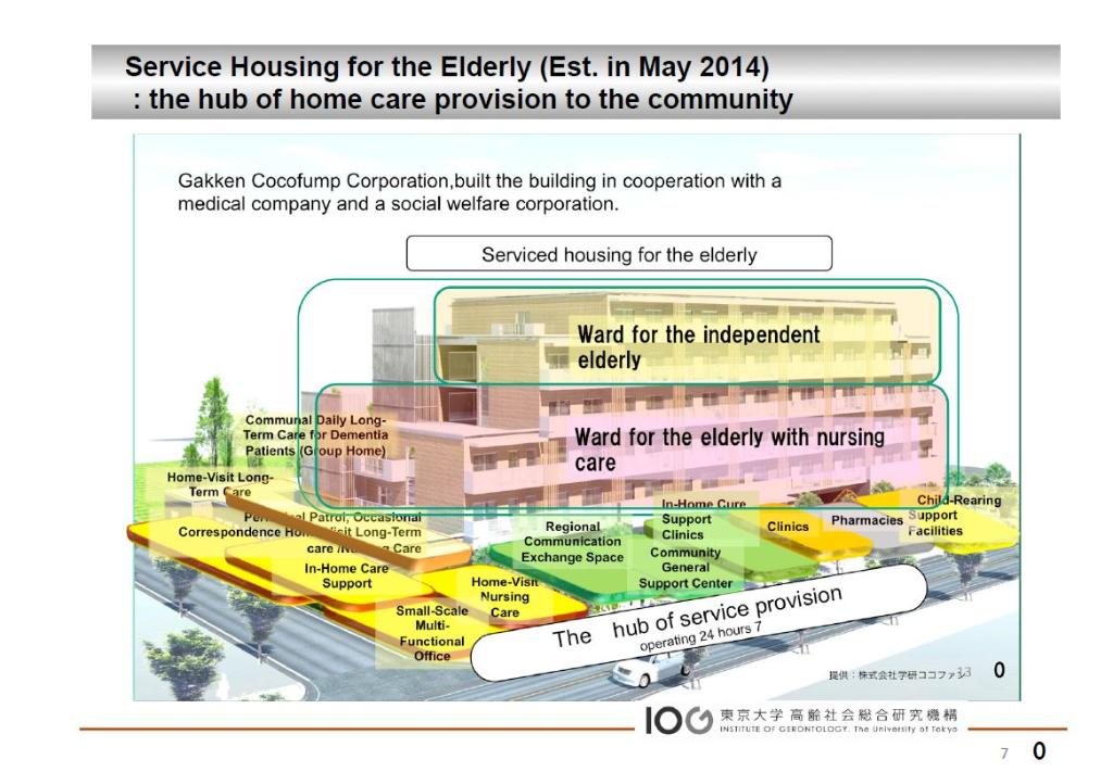 日本政府在政策上有很多支持老龄化的动作,比如社区概念化,将老年公寓与社区医疗服务中心及其他的便民设施结合形成综合体,在近郊的老龄化城市已经进行推广。