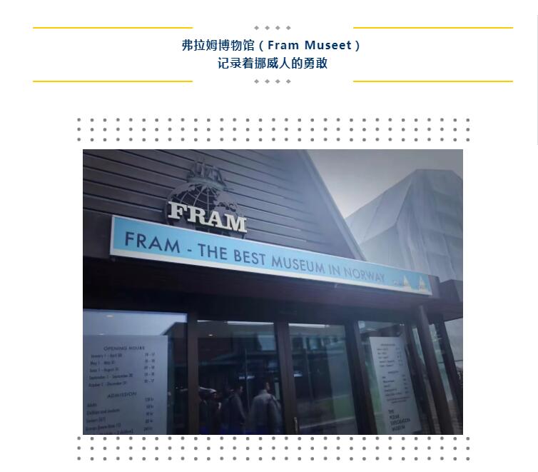 “Fram”是挪威语“前进”的意思,在弗拉姆博物馆内有一艘名为“弗拉姆号”的科考探险船。这艘木质科考探险船的船身并不十分庞大,却曾两次勇敢并光荣地随探险家们分别在1893年穿越北极、北冰洋和1910年探访南极、太平洋,在那个时代,除它以外,世界上没有第二艘船行驶过地球两极。