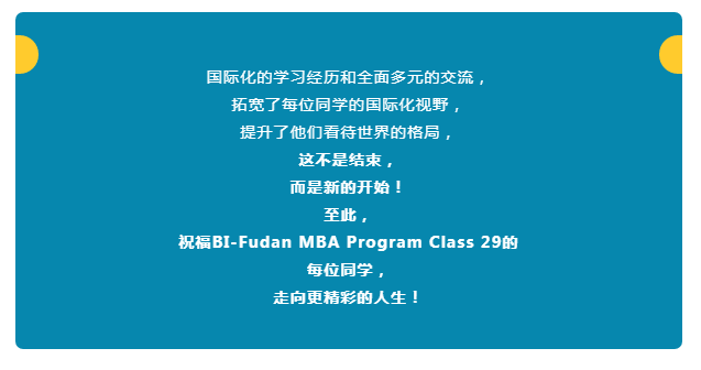今年九月下旬,29班即将毕业,那场跨越国度前往BI挪威商学院的毕业典礼,将为他们的MBA生涯画上圆满句号。而他们,也将在更高的平台放飞梦想,成就自己的非凡人生。