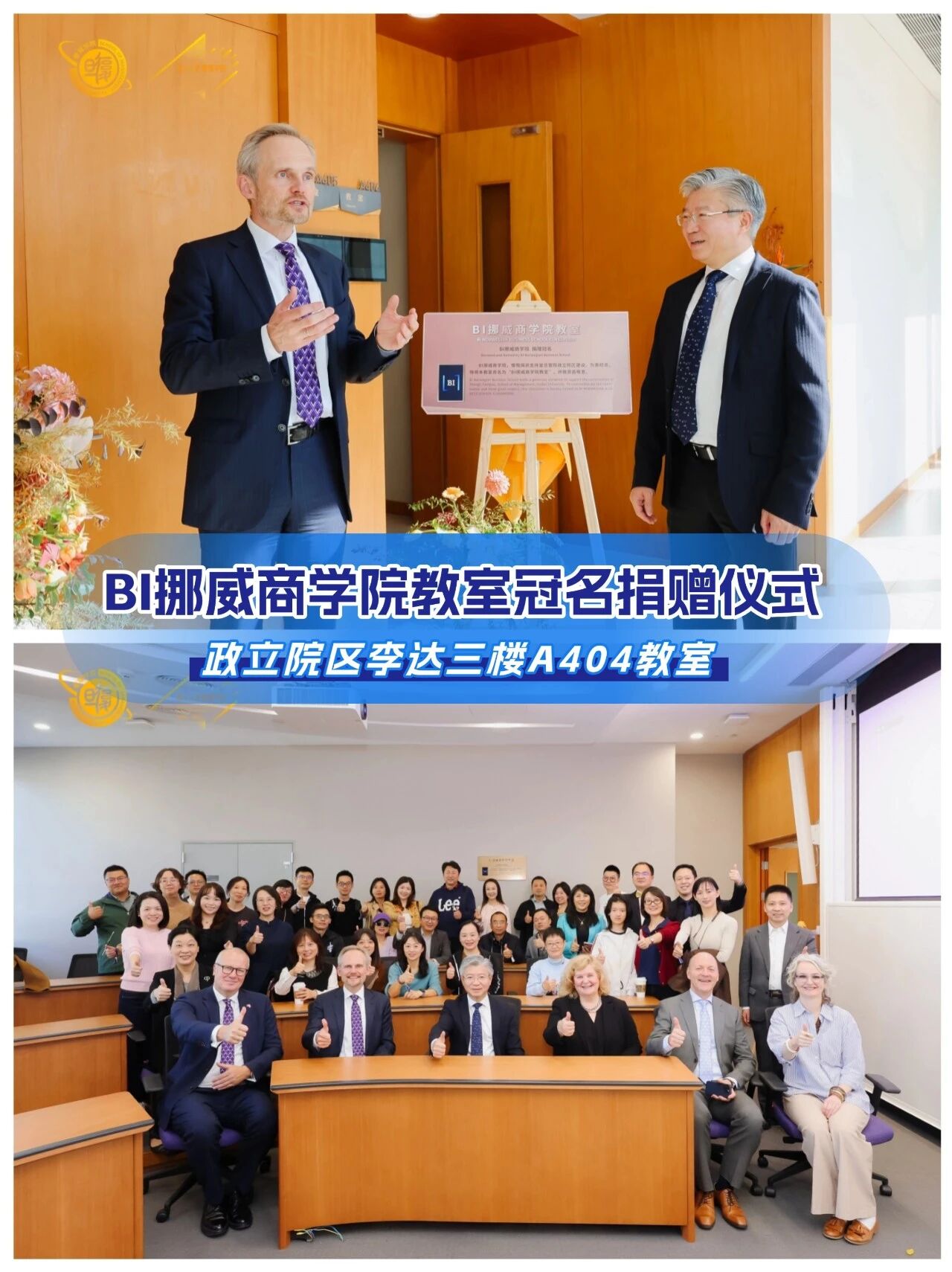 庆典前举行了BI挪威商学院教室(政立院区李达三楼A404教室)冠名捐赠仪式。该教室冠名不仅是两校自1996年联合创办中外合作办学硕士项目的历程见证,成为融合全球视野与本土智慧的载体。此次冠名捐赠诠释了两校“Best of Both”的合作初心,为复旦管院启发管理智慧、开拓知识边界、培育卓越人才的使命注入了新动力。