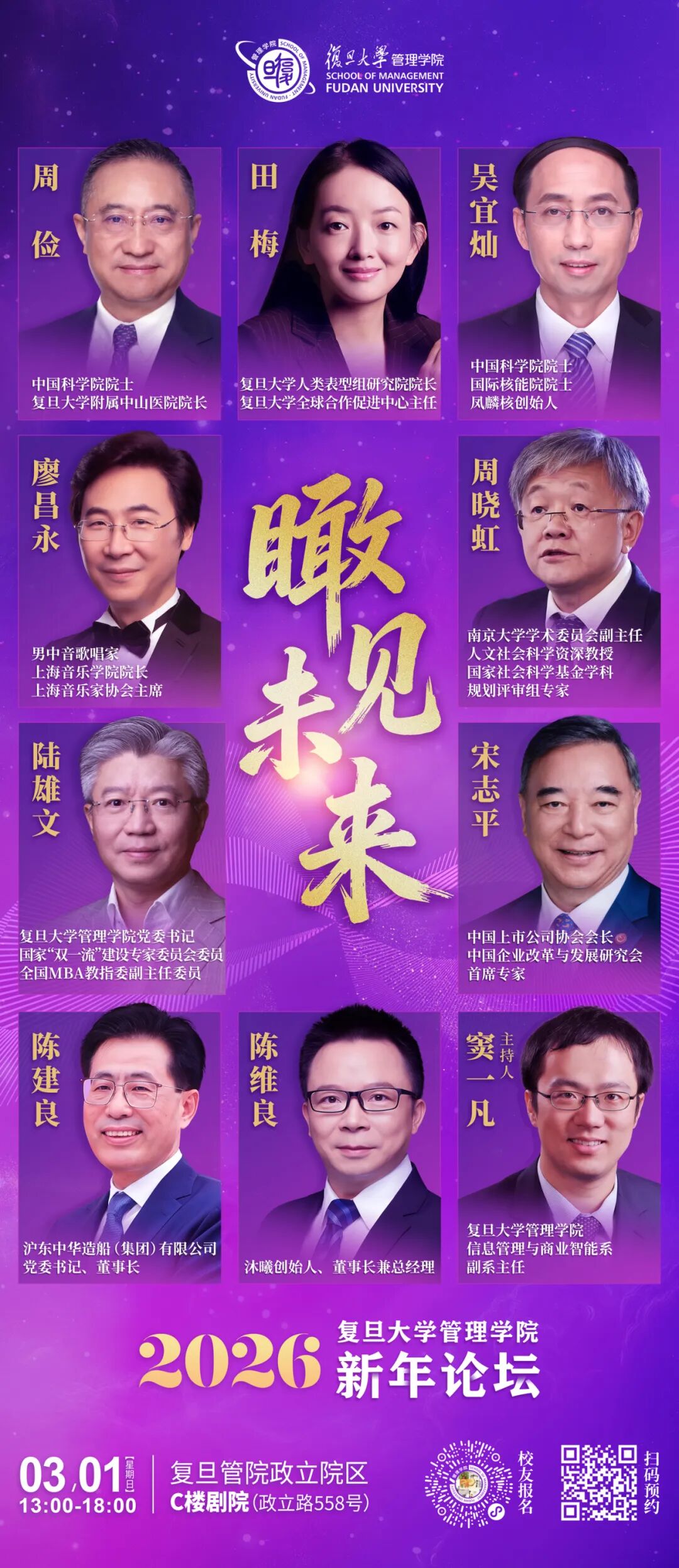 2026年3月1日,复旦大学管理学院新年论坛再度启航。立于“十五五”规划的开局之年,与科学拓界者、商界领军者及人文大家,同解时代之题、共见未来之远。