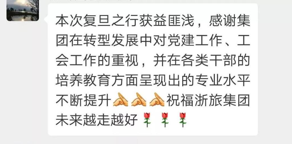 根据浙江省旅游集团2019年“1026”重点工作部署,为大力实施固本强基工程,提高党务工会干部履职能力,3月31日至4月3日,浙江省旅游集团组织党务工会干部赴复旦大学进行专项能力提升培训,浙旅集团党群工作部(工会办公室)和各二、三级企业党务工会干部共43人参加培训。